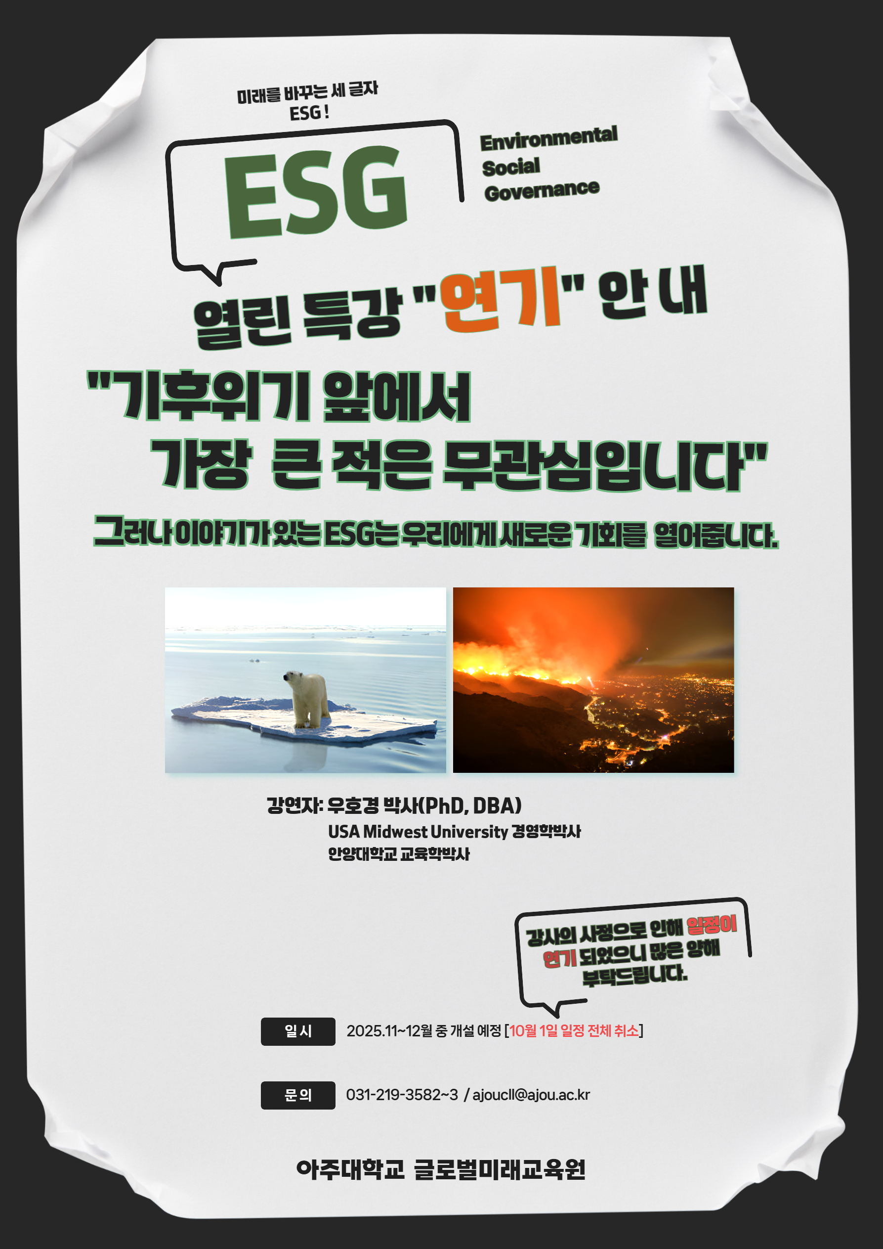 [기타] [ESG 열린특강 연기 안내] 기후위기 앞에서 가장 큰 적은 무관심입니다.